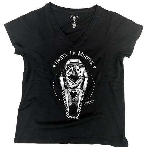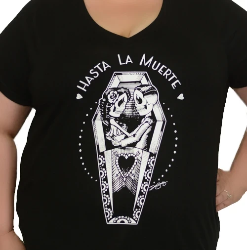 Our women’s plus size t-shirt is made of 100% combed ringspun cotton making it soft. It has a V neck, short sleeves, and a loose-fit design. This t-shirt also features ‘Hasta La Muerte’, a coffin with skulls and a love heart printed at the front. You can pair this t-shirt with a denim skirt or a leather skirt and heels.