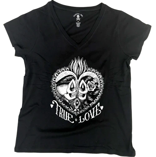 Go Gothic any season in our high-quality ink skull heart print plus-size t-shirt for women. It is a loose-fit and made of 100% cotton premium cotton making it soft and comfortable. The t-shirt has a V neck, short sleeves, and features ‘True Love’ at the front. You can style this t-shirt under a denim jacket, leather jacket, or trench coat during chilly days.