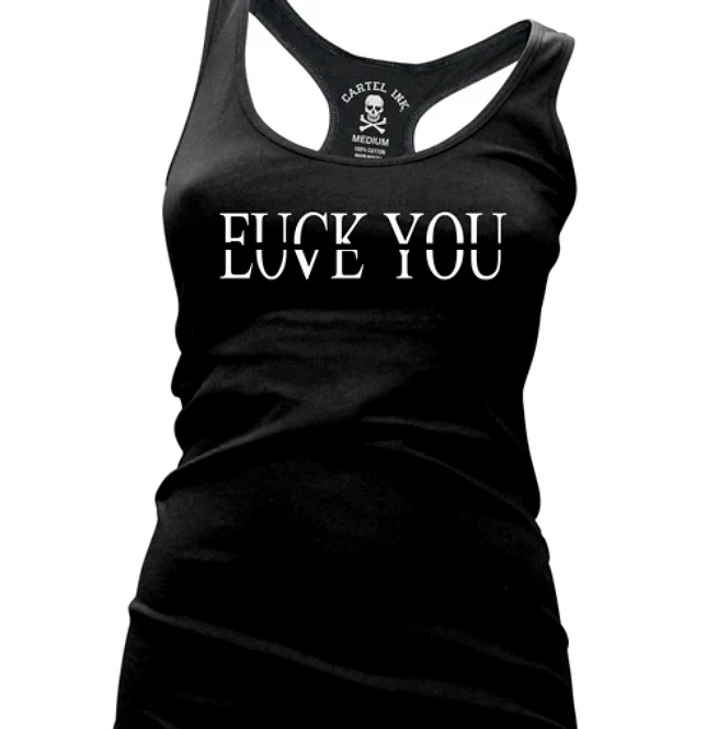 Our women’s tank is made of 100% cotton fabric. It features FUCK LOVE YOU white print on black fabric at the front. The top is slim fitting and has a longer body with a U neck. You can wear this tank top under your favorite button-up shirt.